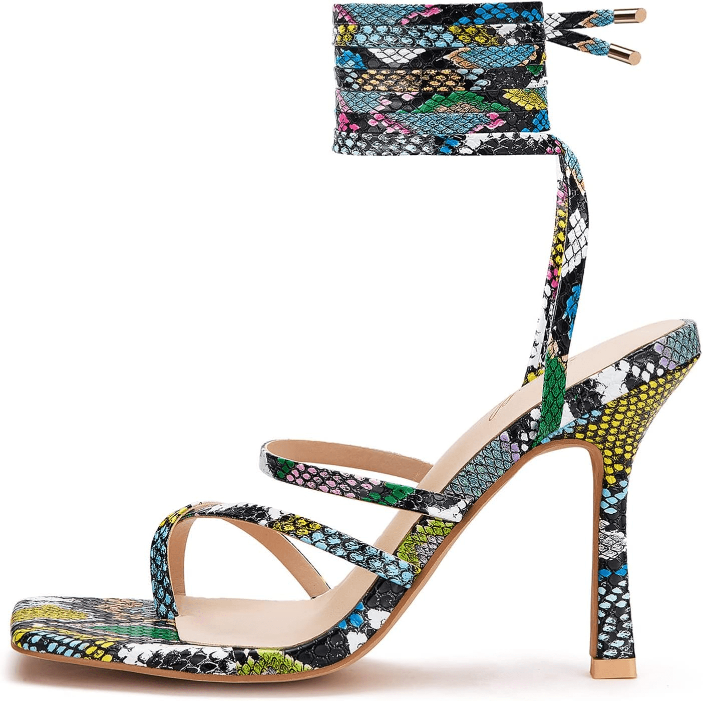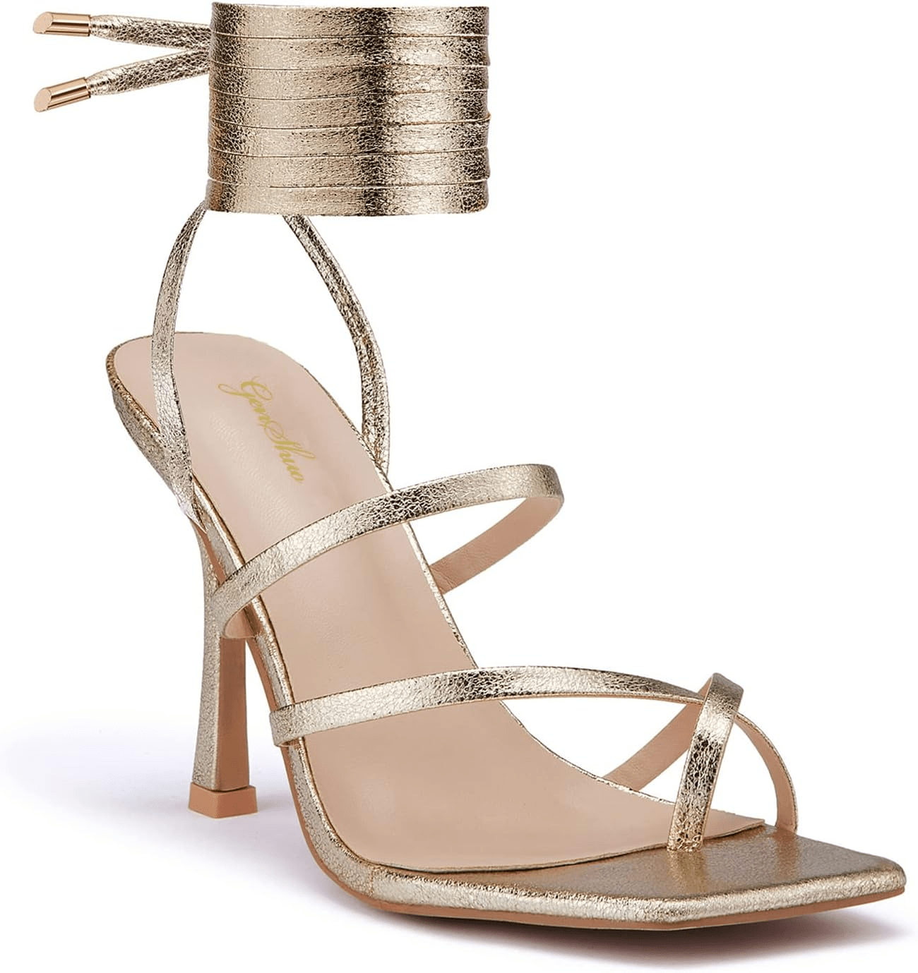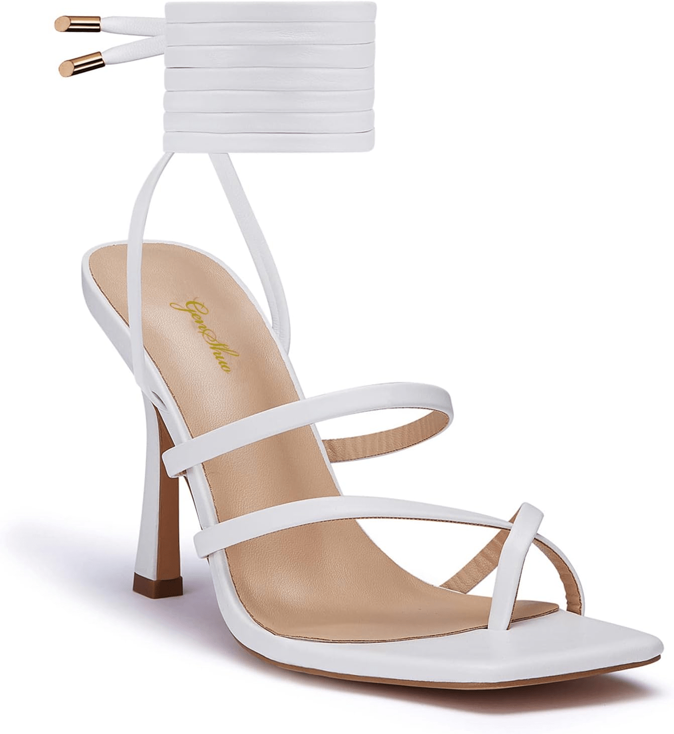 GENSHUO Women’S Heeled Sandals Stiletto Strappy Heels Sexy Open Square Toe Lace up Stilettos Party Wedding Dress Shoes